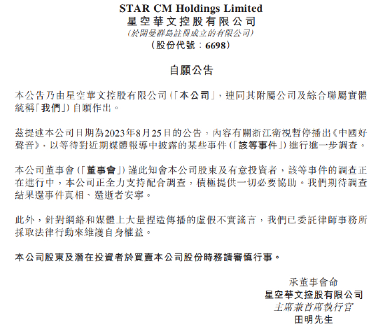 今日,星空华文发布公告称,有关浙江卫视暂停播出《中国好声音》,以等待对近期媒体报导中披露的某些事件进行进一步调查。本公司董事会谨此知会本公司股东及有意投资者,该等事件的调查正在进行中,本公司正全力支持配合调查,积极提供一切必要协助。我们期待调查结果还事件真相、还逝者安宁。此外,针对网络和媒体上大量捏造传播的虚假不实谣言,我们已委託律师事务所採取法律行动来维护自身权益。