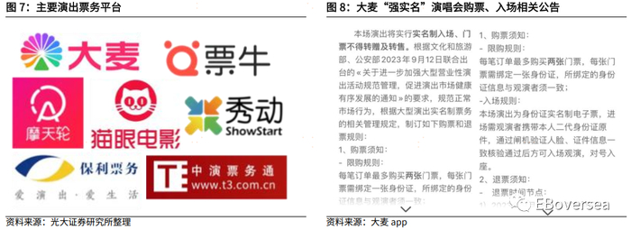 政府与平台协力规范演出票务市场。1)政府政策上,2023年9月文化和旅游部、公安部联合发布《关于进一步加强大型营业性演出活动规范管理促进演出市场健康有序发展的通知》,严格要求票务管理全面落实“强实名”,提出公开售票数量不低于85%,并且严厉整治打击倒票炒票现象,一定程度上压缩了黄牛的生存空间,演唱会“抢票难”有望得到缓解。此外,也敦促演出举办单位建立大型演出活动退票机制,改善以往演出票“不得退改”这一霸王条款下的“退票难”问题。2)平台技术上,演出票务平台一方面在验票环节通过推进电子票、人脸识别等技术实现“强实名”以防止倒票;另一方面,在抢票环节应用安全技术,判别机刷、人肉代刷等黄牛行为。