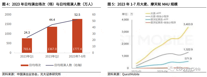 演出需求不断增加,演出票务app活跃度相应高涨。2023年日均演出场次与日均观演人数于第一季度和第二季度逐季度增加,并在暑期进一步增长。据QuestMobile数据,2023年1-7月大麦、摩天轮两大演出票务平台的MAU规模增长迅速。根据易观千帆,大麦作为演出票务龙头,今年月活人数增长显著,MAU在Q1/Q2/M7-M8(暑期)分别为873.1/1612.7/2123.8万人。