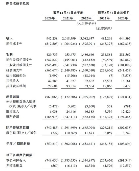 招股书显示,2020年至2022年,第四范式收入分别约9.42亿元、20.18亿元、30.83亿元,营收规模持续增长。不过,同期公司拥有人应占亏损分别约7.50亿元、17.86亿元、16.45亿元。2023年一季度,第四范式收入约6.64亿元,公司拥有人应占亏损约2.91亿元。