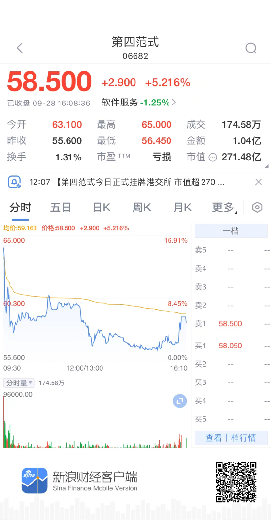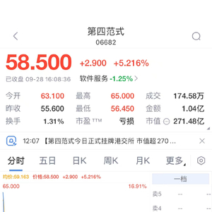 上市首日,第四范式开盘涨13.49%,报于每股63.1港元,对应总市值达293亿港元,盘中持续回落,截至今日收盘,第四范式股价报58.5港元/股,较发行价上涨5.22%,总市值为271.48亿港元,股价早间一度最高达65港元/股。