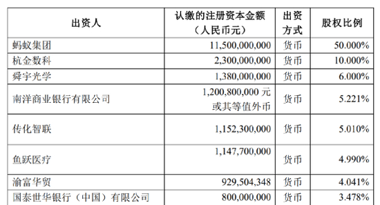 从股权比例来看,在此次增资后,蚂蚁集团仍然以50%的持股比例,位列第一大股东;第二位是杭金数科,持股比例为10%;第三大股东是舜宇光学,持有6%的股权。而南洋商业银行的持股比例下降到5.221%,位列第四大股东;宁德时代的持股比例也下降到了2.783%,降至第十大股东。