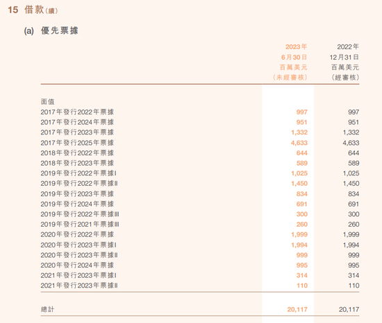 中国恒大上述重组方案涉及的美元债约191.5亿美元。而根据中国恒大2023年半年报,其存续的美元优先票据合计约201.17亿美元。