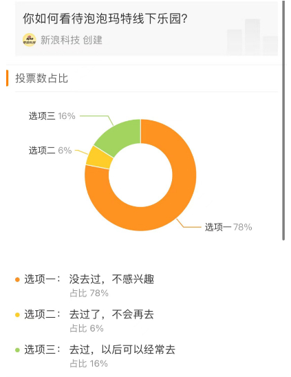 新浪科技探访发现,除中产家庭和狂热粉丝外,泡泡玛特乐园的性价比较低。一份微博投票显示,有78%的消费者并不认可泡泡玛特乐园,直言不感兴趣,以后也不会去。