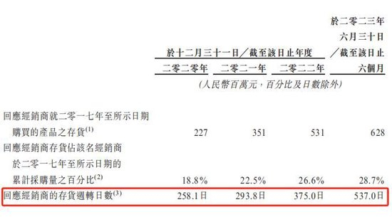 招牌产品销量下滑,没有卖掉的变成了库存。2020年、2021年、2022年及2023年上半年,经销商的存货周转日数分别为258.1日、293.8日、375.0日及537.0日,呈逐年上升趋势。