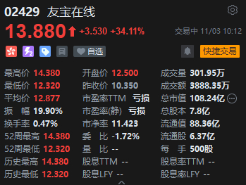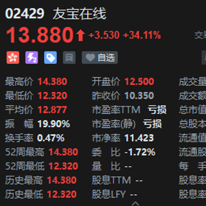 11月3日消息,友宝在线定价10.35港元,上市首日高开20%,截至发稿,股价上涨34.11%,报13.88港元,总市值108.24亿港元,成交额3888.35万港元。