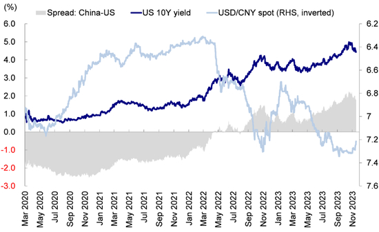 往前看,提振国内经济增长的关键在于财政推动的信贷扩张,尤其在其他部门没有能力或意愿加杠杆时。换言之,中央加杠杆是“对症”的方向。当前财政发力的规模和速度都有待加强,如果后续财政投放可以带动企业和居民贷款,有望发挥宽信用的主要抓手作用,这也是提振市场情绪更为对症的思路。外部方面,美债利率和中美关系均有缓和,但仍需关注不确定性可能带来的扰动。美债利率的回落方向已经确定,我们测算10年美债中枢为3.9%,并随着加息暂停和降息开始而逐步下降。