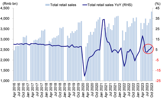 10月经济数据表明中国经济整体仍在修复,但也仅是温和修复。消费方面,10月社会消费品零售总额在低基数、假期和双十一购物节前置等因素支撑下同比增长7.6%,增速较9月加快2.1ppt。但从交易额来看,双十一购物节表现相对平淡,星图数据显示,10月31日-11月11日期间,综合电商平台及直播平台累计销售额1.14万亿人民币,同比仅小幅增长2.08%[1]。投资方面,10月固定资产投资单月同比增长1.2%,低于9月的2.4%,其中制造业持平上月,而房地产、基建增速皆有所下滑,1-10月全国房地产开发投资同比下降9.3%,较1-9月的-9.1%进一步走弱,此外,CPI、PPI以及信贷和社融数据的疲软也说明国内整体需求仍然偏弱[2]。