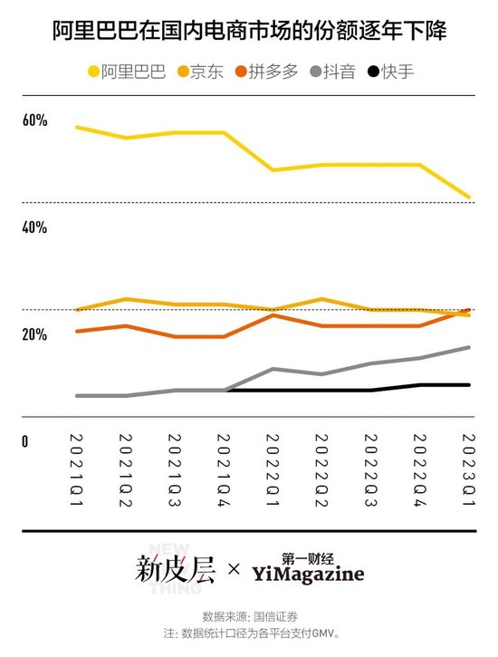 2021年,阿里巴巴中国商业(主要是淘宝和天猫,简称淘天)板块的商品交易总额(GMV)增速首次降到了个位数的6%——前一年,这部分生意还成长了14%。2021年也是淘天GMV实现同比增长的最后一年。