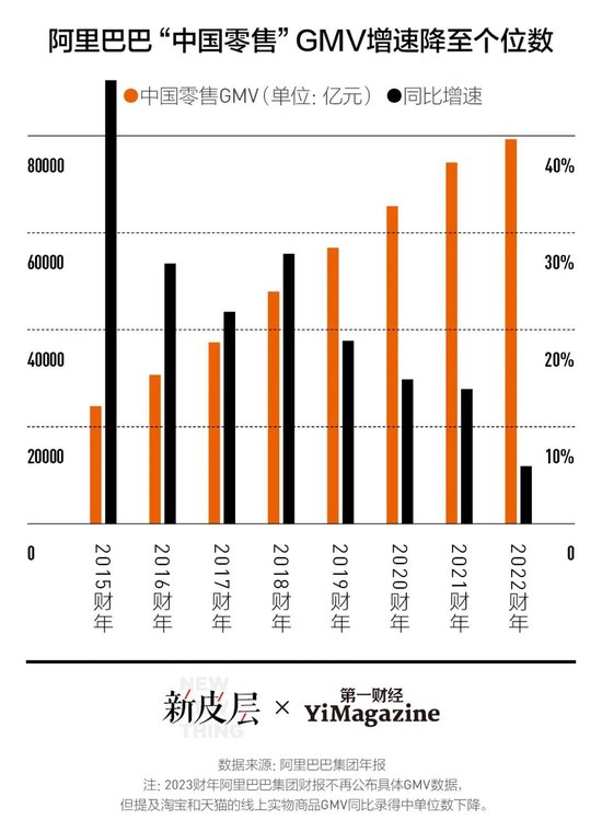 那一年“双11”,阿里巴巴首次不再公布淘宝、天猫的销售GMV(Gross Merchandise Volume,即商品交易总额)。随后,阿里巴巴2022财年(2021年4月至2022年3月)的年报数据显示,期内公司营收增速从上个财年的41%滑落至19%;作为阿里巴巴的利润支点,中国商业板块实现净利润1725亿元,同比下滑10%。