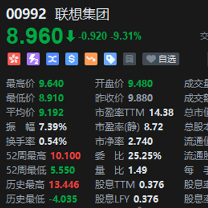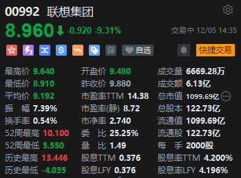 12月5日消息,截至发稿,联想集团跌9.31%,报8.96港元,成交额6.13亿港元。