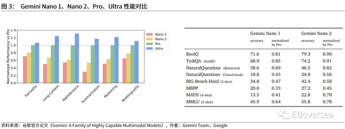 3)推出设备端专用的轻量级Gemini Nano。GeminiNano-1和Nano-2的参数仅达到18亿和32.5亿,但在事实性任务、推理、多模态、多语种等任务上表现出了较优秀的性能。