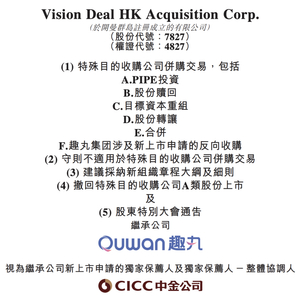 趣丸集团发公告显示,特殊目的收购公司并购交易将导致Vision Deal与趣丸集团合并,以及趣丸集团的股份于联交所上市。