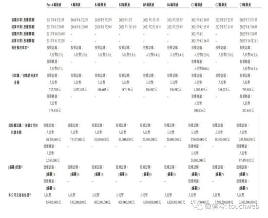 知行汽车2018年A轮融资时每股成本为3.5元,B1和B2轮每股成本为5.3元,B3和B4轮每股成本为6.4元,C1轮每股成本为12.5元,C2轮每股成本为13.8元,C3轮每股成本为16.2元。