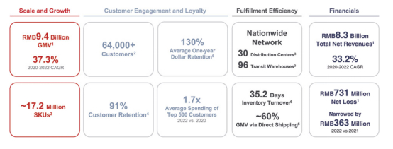为不断增强供应能力,震坤行开发了一个专有的“价格比较系统”,以实现产品竞争力。目前震坤行特有的“行家精选”产品线已管理超过38.3万个SKU,其中包括34.7万个自有品牌产品的SKU,例如专注PPE细分市场的全资子品牌“安丹达”等。截至2023年前三季度,震坤行平台精选产品线的GMV贡献占比为8.2%,同期自主品牌产品的GMV贡献为5.0%。
