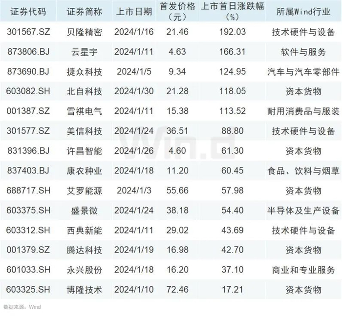 2024年1月,A股市场共有14家公司首发上市,合计IPO募资总额为118.8亿元。在上市首日表现方面,1月新股无一破发,A股新股市场已连续3个月实现“0破发” 。