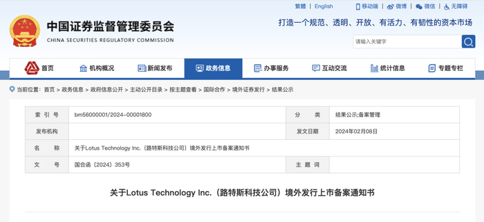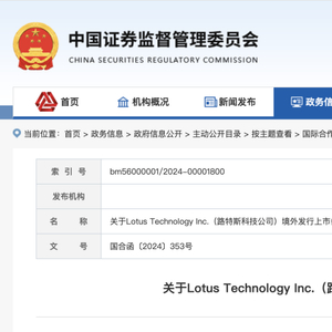 近日,中国证监会网站发布关于Lotus Technology Inc.(路特斯科技公司)境外发行上市备案通知书。