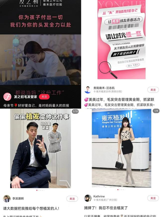 雍禾的营销喜欢打情感牌。例如,雍禾旗下女性植发品牌“发之初”多次发出“从‘头’好好爱自己,让秀发焕发青春活力”“你为孩子付出一切,我们为你的头发全力以赴”等口号。