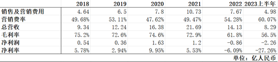 所以,尽管雍禾医疗的毛利率普遍较高,2018年-2021年都在70%以上,2022和2023上半年为61.8%和56.5%;但净利率却非常低,最好时也没超过10%。