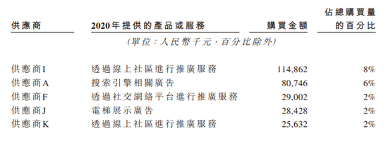 雍禾医疗的招股书显示,2020年,其前五大供应商提供的产品或服务内容,几乎都是广告服务,涉及电梯、搜索引擎、社交网络平台等。从通勤路上到闲暇时刷刷手机,雍禾植发全方位渗透打工人的生活。