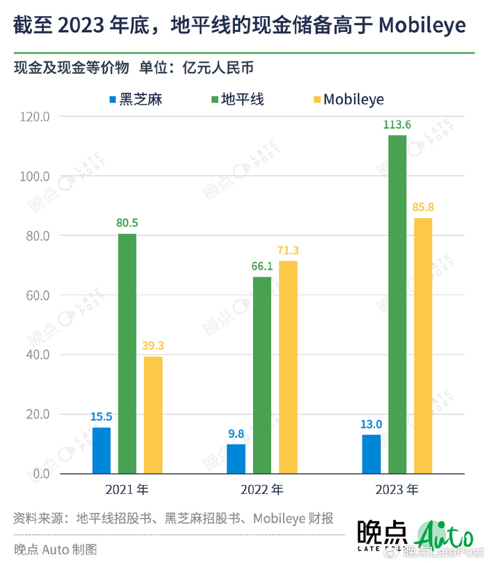 虽然还未实现扭亏,但地平线的现金储备还很充沛。截至 2023 年底,地平线的现金及现金等价物合计 113.6 亿元,远高于黑芝麻的 13.0 亿元,同时也高于 Mobileye 的 85.8 亿元。