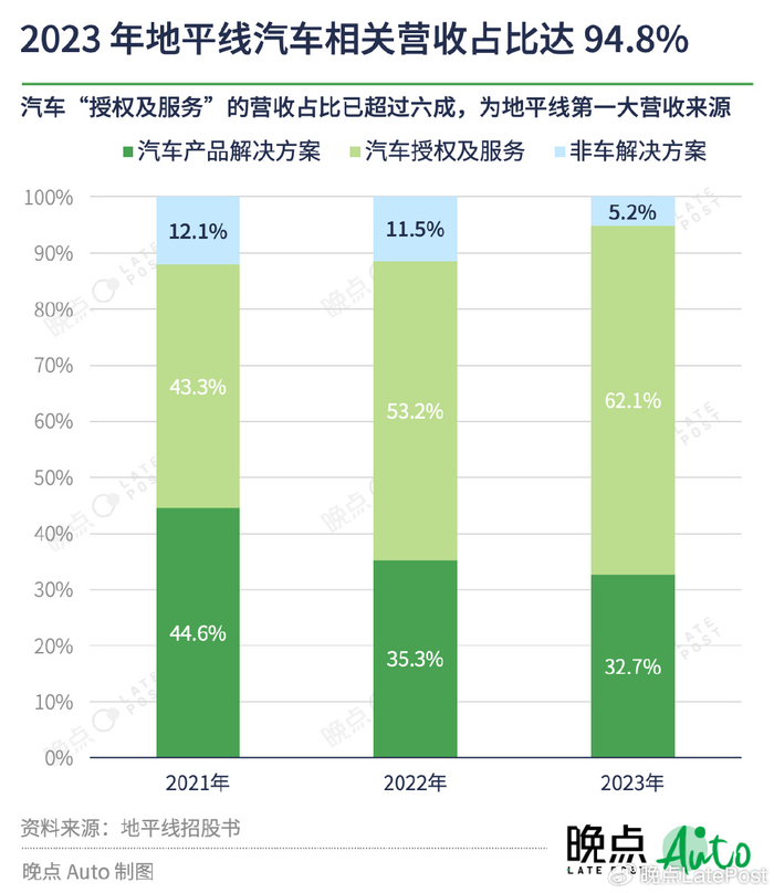 2021 年至 2023 年,“产品解决方案” 为地平线带来的收入占比从 44.6% 下降到 32.7%;第二类 “授权及服务” 的收入占比从 44.3% 上升到为 62.1%。