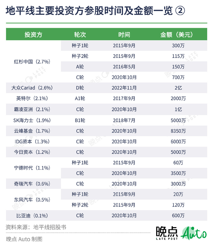 东风、奇瑞、比亚迪也是地平线的股东。东风投的最早,参与了种子轮投资。奇瑞和比亚迪在地平线 C 轮融资中同时进入,分别投了 3000 万美元和 600 万美元。