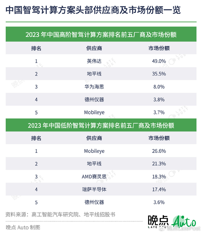 高阶智驾市场的第一名是英伟达,市场份额为 49.0%(高工数据)。低阶智驾市场的第一名是 Mobileye,市场份额是 26.6%(地平线招股书)。