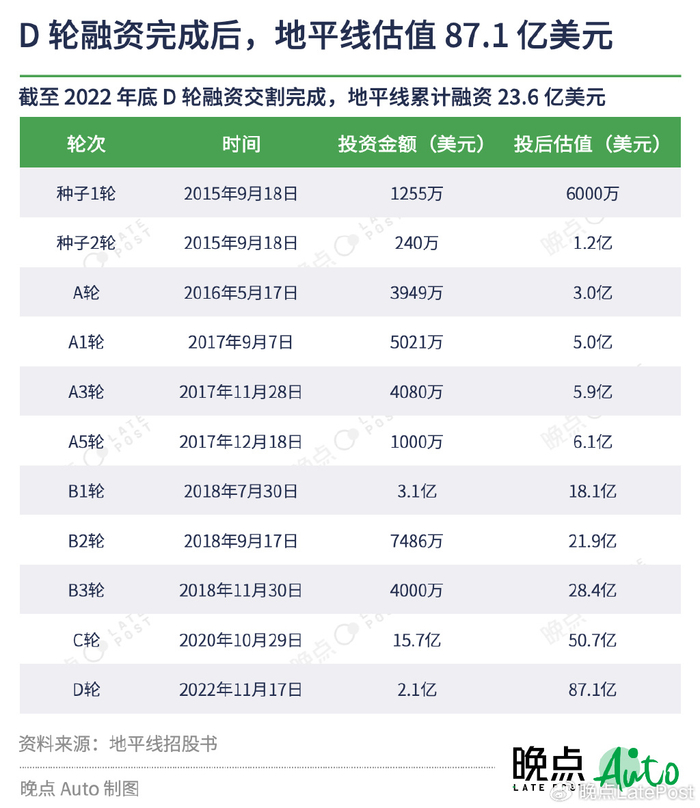 截至 2022 年 12 月 D 轮融资交割完成,地平线的投后估值为 87.1 亿美元。