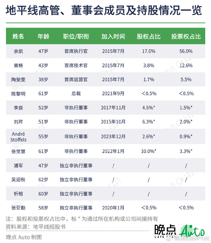 4 名执行董事同时也是地平线的核心管理层。其中创始人余凯持股 17%,拥有 56 % 的投票权;CTO 黄畅、COO 陶斐雯分别拥有地平线的 3.8% 和 1.7% 的股权,对应 12.6% 和 5.5% 的投票权。三名地平线管理层合计持股 22.6%,对应 74.0% 的投票权。总裁陈黎明于 2021 年 9 月加入地平线,持股不超过 0.5%。