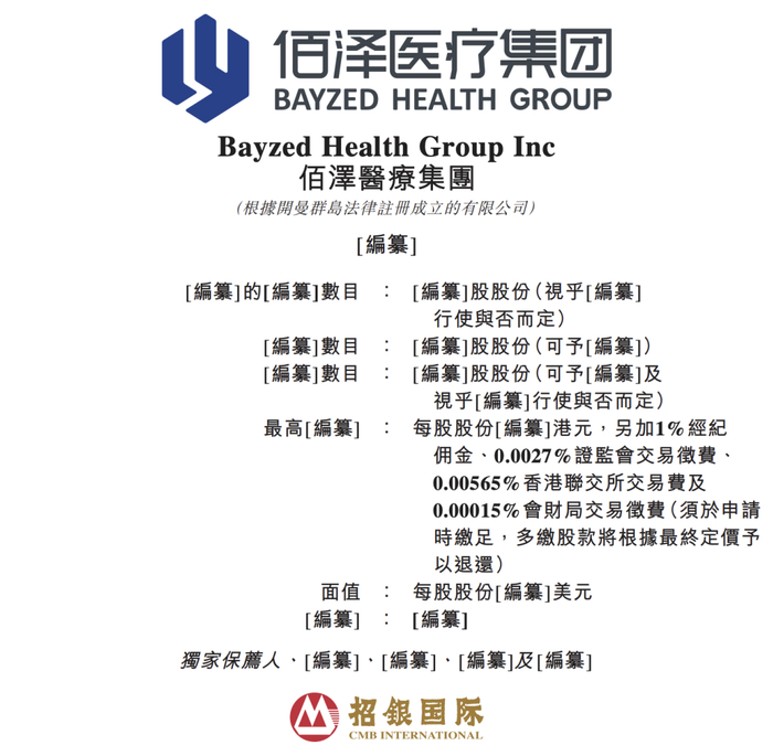近日,佰泽医疗集团Bayzed Health Group Inc向香港联交所提交上市申请,拟在香港主板挂牌上市,招银国际担任独家保荐人。