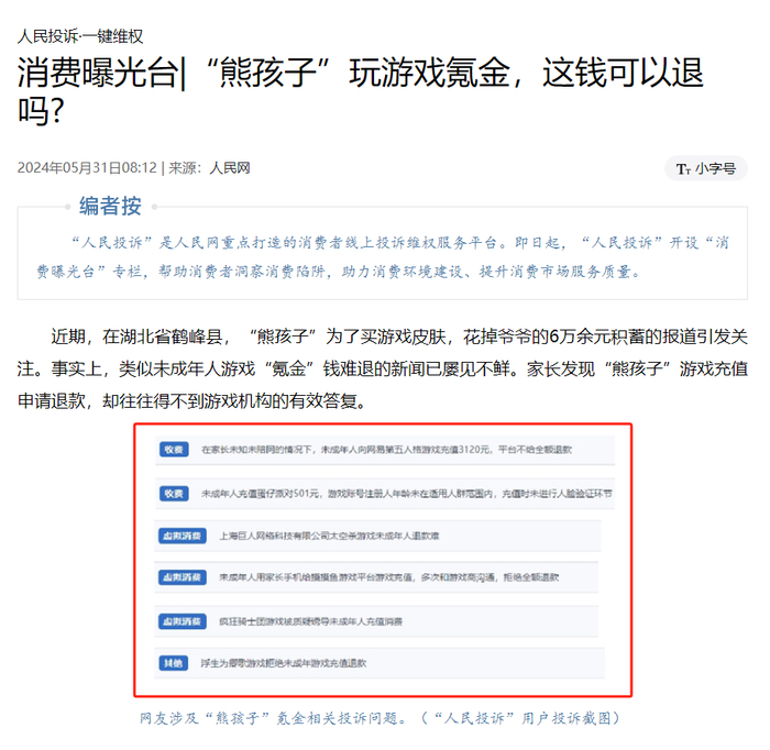 在人民网“人民投诉”平台上,涉及未成年人网游大额充值的纠纷显著增多,投诉对象包括网易的第五人格游戏、蛋仔派对,以及巨人网络的太空杀游戏、疯狂骑士团等。