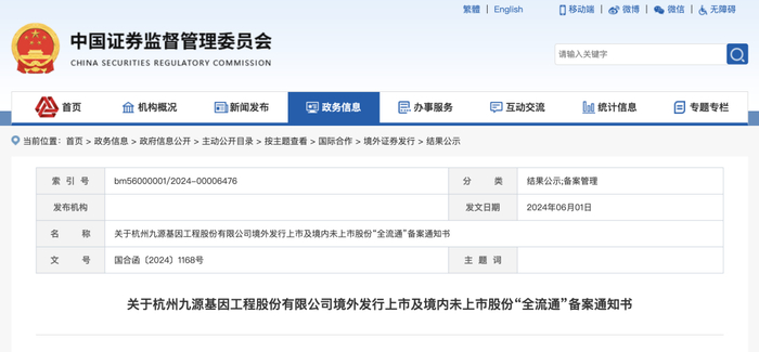 中国证监会网站发布关于杭州九源基因工程股份有限公司境外发行上市及境内未上市股份“全流通”备案通知书。九源基因将计划发行不超过7667万股普通股并在香港交易所上市。公司10名股东拟将所持合计7068万股境内未上市股份转为境外上市股份,并在香港联合交易所上市流通。