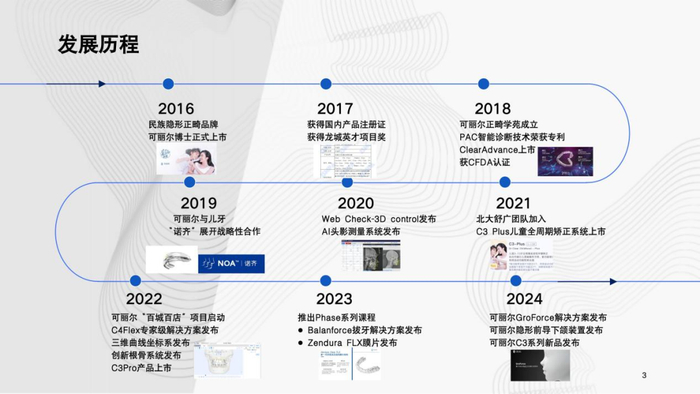 近些年,可丽尔博士利用强大的软件团队和专业的医学研发团队不断推出创新产品,如GroForce儿童及青少年生长改良解决方案、BalanForce拔牙解决方案、HE附件模板、强化隐形矫治器、隐形口外弓、隐形下颌前导、隐形颊面管、可丽尔博士 Clear III (改良式FR-III)、C4 Flex数字化隐形矫正、基于根骨系统的牙槽弓坐标系、动态𬌗系统、AI头影测量自动诊断系统和Clear-Check方案审阅系统等。2024年度,可丽尔博士C3儿童全周期矫治系统升级为可丽尔C3儿童青少年全周期矫治系统,扩展了产品的边界,产品体系演变得更加包容和开放。