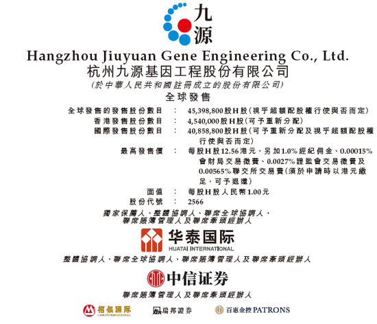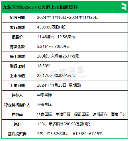 九源基因,计划全球发售4539.88万股H股(占发行完成后总股份的18.50%),其中90%为国际发售、10%为公开发售,另有15%超额配股权,每股发售价介乎11.48港元至12.56港元,每手200股,最多募资约5.70亿港元。