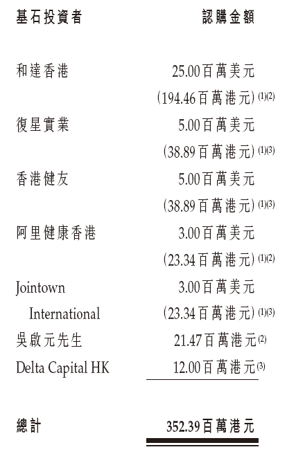 九源基因此次IPO招股引入7名基石投资者,合共认购约3.52亿港元的发售股份,包括和达香港认购2500万美元、复星医药(600196.SH,02196.HK)通过复星实业认购500万美元、健友股份(603707.SH)通过香港健友认购500万美元、阿里健康(00241.HK)通过阿里健康香港认购300万美元、九州通(600998.SH)通过Jointown International认购300万美元、君亨酒店(301073.SZ)创始人吴启元先生认购2147万港元、Delta Capital认购1200万港元。