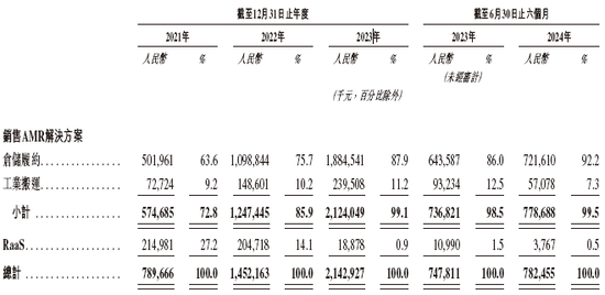 极智嘉的收入主要来自核心产品AMR解决方案的销售,此外一小部分收入来自RaaS服务,提供标准化机器人租赁服务以及一整套营运支持及管理服务,以优化客户的仓储运作。