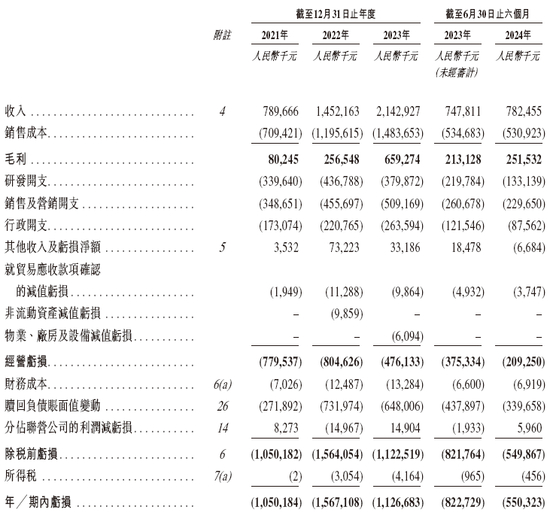 财务数据显示,在过去的2021年、2022年、2023年和2024年上半年,极智嘉的营业收入分别为人民币7.90亿、14.52亿、21.43亿和7.82亿元,相应的净亏损分别为人民币10.50亿、15.67亿、11.27亿和5.50亿元,相应的经调整净亏损分别为人民币7.63亿、8.15亿、4.44亿和1.94亿元。