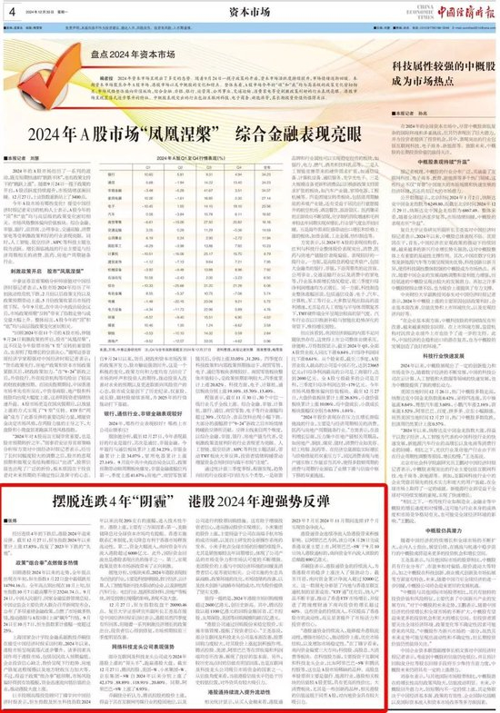 编者按 2024年资本市场呈现出了多变的态势。随着9月24日一揽子政策的开启,资本市场活跃度持续提升,市场情绪逐渐回暖。本期资本市场聚焦今年A股市场、港股市场以及中概股的变化和特点。整体来看,A股市场今年的“顶”和“底”均与高层级的政策变化密切相关,市场风格整体偏向价值板块,综合金融、非银、银行、运营商、公用事业、交通运输、消费家电等受刺激政策利好的行业表现亮眼。港股市场呈现震荡式逐步攀升的特征。中概股表现突出的行业包括互联网科技、电子商务、新能源等,其长期投资价值仍值得关注。