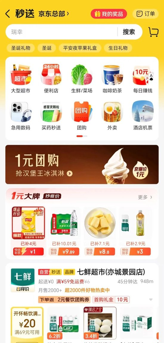 京东秒送上线团购、外卖、酒旅入口