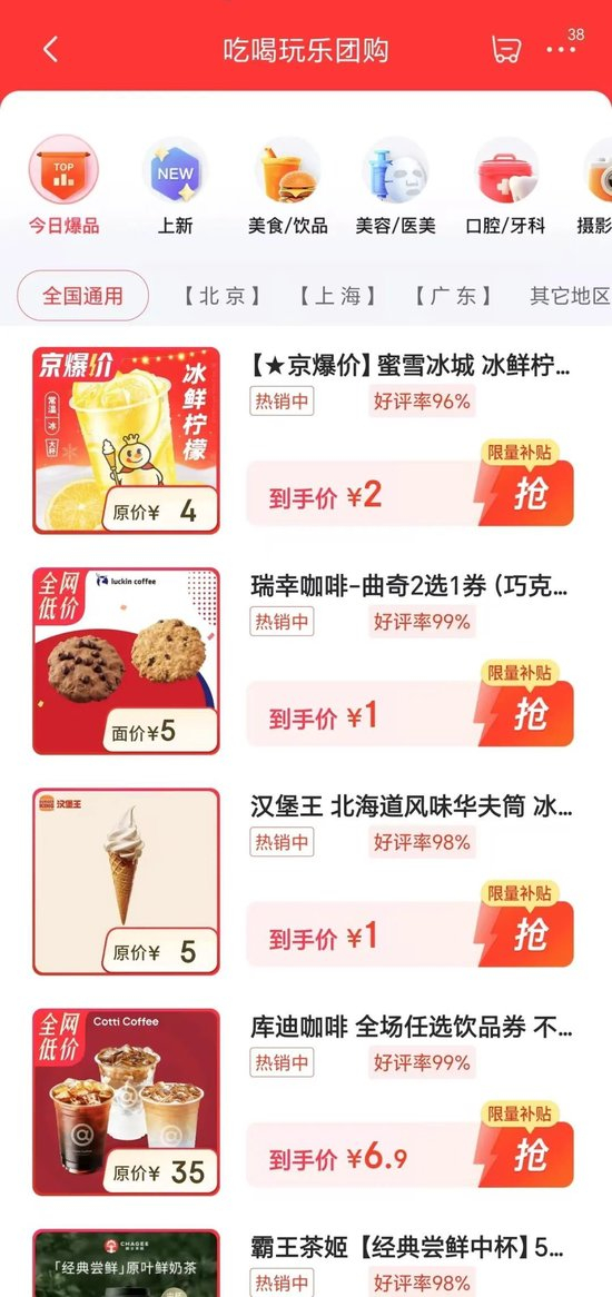 目前来看,美食饮品团购主要开放的是北京、上海和广东地区。对于美食饮品团购,京东依然在用惯常的思路即低价做引流。按照京东的说法,‘餐饮团购上京东,又好又便宜’、‘超值团购,随心囤’。我们看到,有一元的汉堡王华夫筒,还有两元京爆价的蜜雪冰城以及1元的永和大王现磨豆浆。以及刚才提到的2元团购补贴。