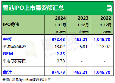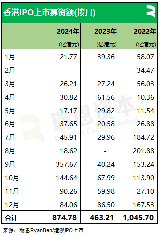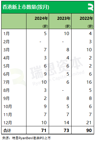2024年香港新上市公司共 71家(其中70家通过IPO上市、1家借壳SPAC上市),募资874.78亿(港元,以下同),新上市数量较上年同期减少2家,募资金额按年增加411.57亿或 88.85%。