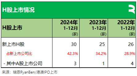今年共 30家H股公司在港交所上市,占全部新上市公司的42.3%;