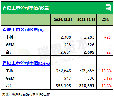 截至2024年12月31日,港交所上市公司2,631家,其中主板2,308家、GEM 323家。