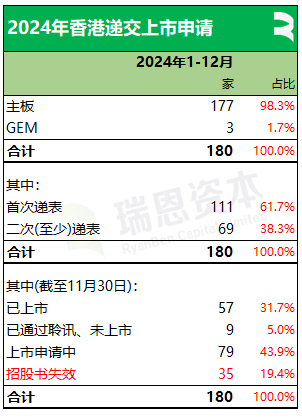 今年在香港交易所递交上市申请共180宗,来自主板177宗、GEM 3宗。