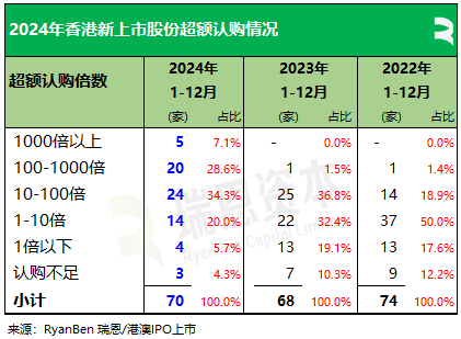 今年IPO超额认购在50倍以上的28家,占所有IPO公司的40%,2023年只有2家、占1.9%。