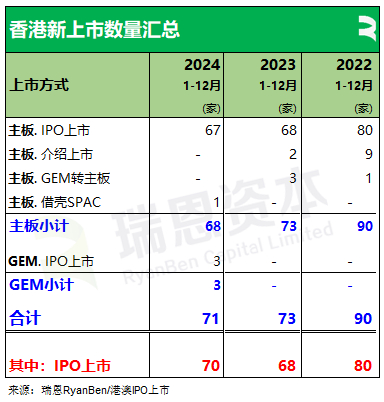 今年香港新上市公司共71家,其中主板上市68家(IPO上市67家、借壳SPAC1家)、GEM上市3家(IPO上市3家)。