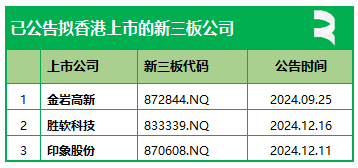2024年正式发布公告拟香港上市的新三板企业共3家,其中的金岩高新刚刚在港交所递表。
