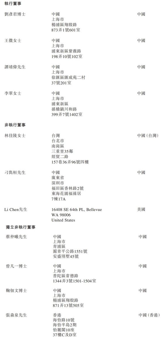 宝济药业执行董事分别为刘彦君博士、王征女士、谭靖伟、李翠女士;非执行董事分别为林佳陵女士、刁隽桓、LiChen,独立非执行董事分别为蔡仲曦、曾凡一博士、鞠佃文博士、张森泉。