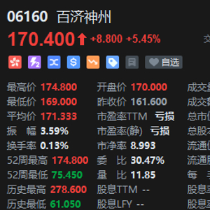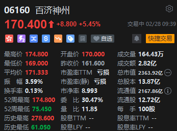 2月28日消息,港股百济神州开盘大涨超5%,现报170.4港元,成交额2.82亿港元。